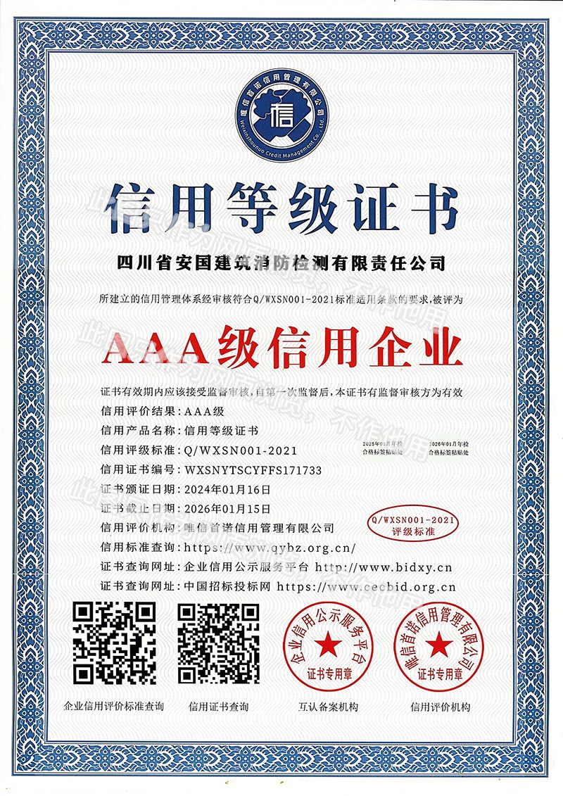 四川省安國建筑消防檢測有限責(zé)任公司,成立于1998年,經(jīng)四川省公安消防總隊(duì)批準(zhǔn),工商部門注冊的獨(dú)立法人單位。